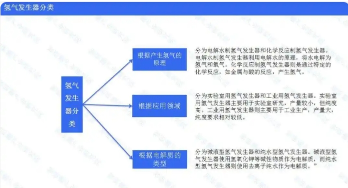 氫氣發(fā)生器根據(jù)產(chǎn)生氫氣的原理,可以分為電解水制氫氣發(fā)生器和化學(xué)反應(yīng)制氫氣發(fā)生器,前者利用電解水的原理將水電解為氫氣和氧氣,后者則通過(guò)特定的化學(xué)反應(yīng)如金屬與酸的反應(yīng)產(chǎn)生氫氣。根據(jù)應(yīng)用領(lǐng)域可以分為實(shí)驗(yàn)室用氫氣發(fā)生器和工業(yè)用氫氣發(fā)生器,前者主要用于實(shí)驗(yàn)室研究,產(chǎn)量較小但純度高,后者則主要用于工業(yè)生產(chǎn),產(chǎn)量大但純度要求相對(duì)較低。此外,根據(jù)電解質(zhì)的類(lèi)型,電解水制氫氣發(fā)生器又可以分為堿液型氫氣發(fā)生器和純水型氫氣發(fā)生器,前者使用氫氧化鉀等堿性物質(zhì)作為電解質(zhì),后者則使用去離子純水作為電解質(zhì)。