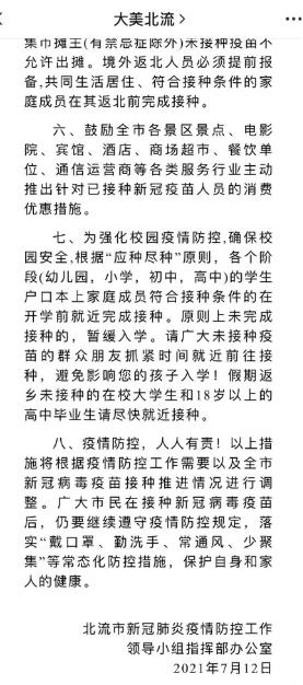 7月12日,廣西桂平市新型冠狀病毒肺炎疫情防控指揮部發(fā)出通告:凡年滿18周歲以上(戶籍不限)且無疫苗禁忌癥的人員均須接種。為強化校園疫情防控,確保校園安全,根據(jù)“應(yīng)種盡種”原則,各個階段(幼兒園,小學(xué),初中,高中)的學(xué)生戶口本上家庭成員符合接種條件的在開學(xué)前就近完成接種。原則上未完成接種的,暫緩入學(xué)。
